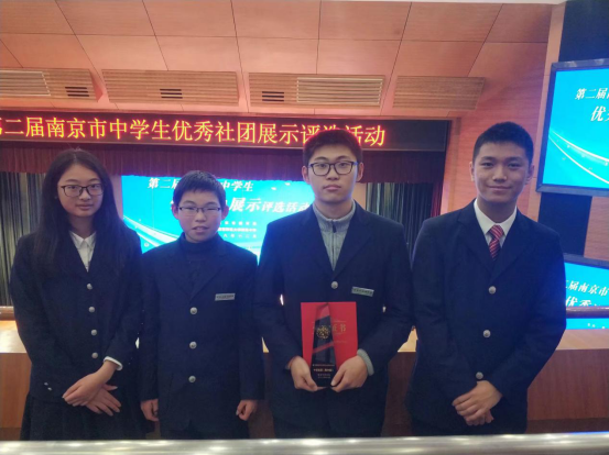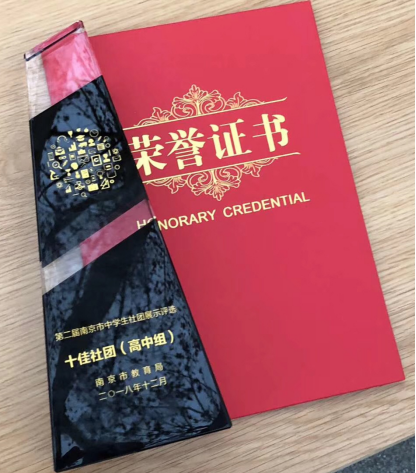 2018年12月23日下午,南京市第二届中学生优秀社团展示评选活动在南京师范大学附属中学举行,本次活动由南京市教育局中学教育处组织,经过市级审核,选出45个社团入围南京市中学生优秀社团评选,我校手绘社和化学生活社在吕燕书记带队下,在6分钟社团成果汇报和2分钟评委提问环节均表现出色,双双荣获“南京市十佳社团(高中组)”称号。