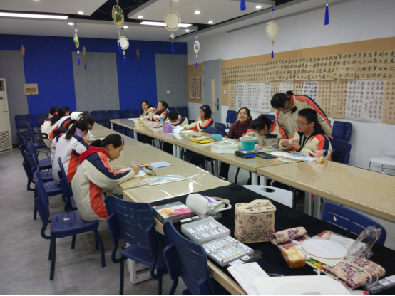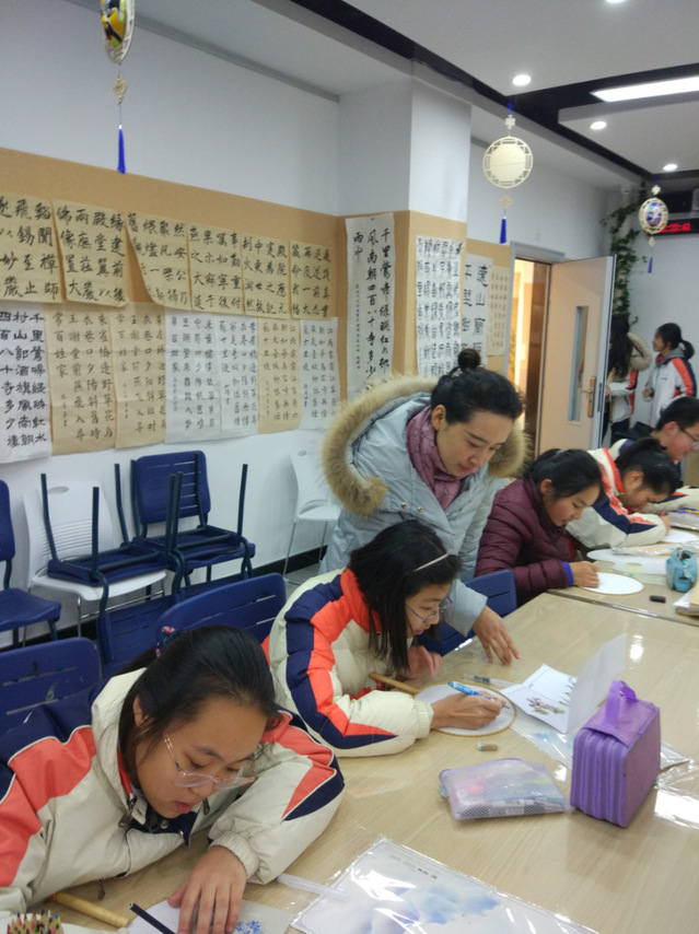 王媛老师指导着画作,欣赏着作品,她表示有意将团扇绘制带入美术课堂~