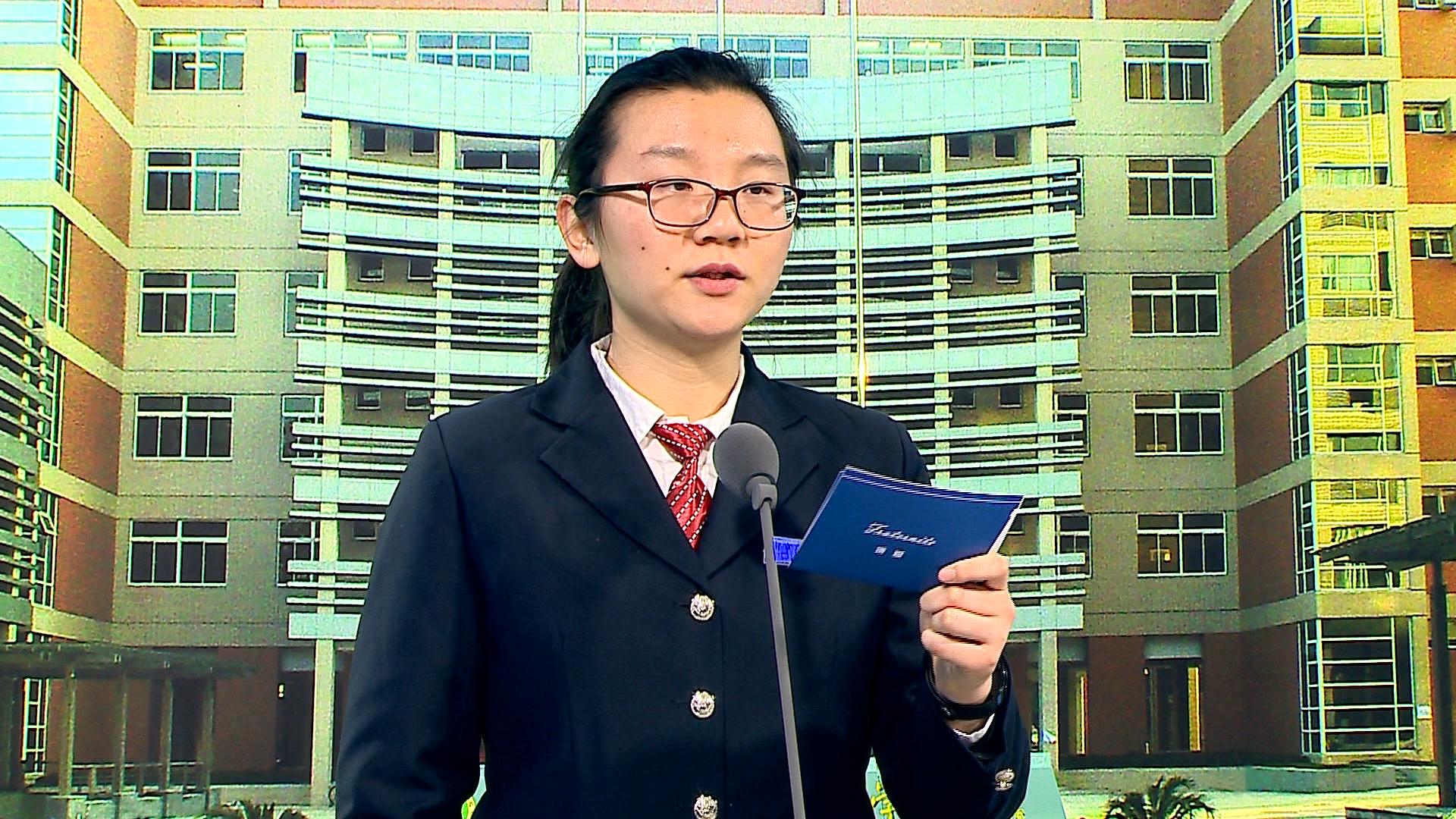 高三(2)班的万毓淇同学作为学生代表讲话。万同学心系中国航空领域,立志投身研究事业,为实现人生理想而不懈努力,积极备战109天后的高考,为同学做出表率。