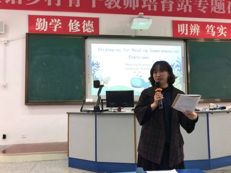 最后,李爱云老师作了《核心素养背景下的中学英语课外阅读》专题讲座。李老师先分享了她在2018TESOL大会中的所见所闻和心得体会,希望老师们在教学过程中时刻记得把学生“核心素养”的培养落实到每一节课堂,在英语教学中立德树人。随后,她又结合前沿的教育理论和课标要求,以教学实例的形式分享了南外报刊阅读教学的具体做法,大家都表示受益匪浅。