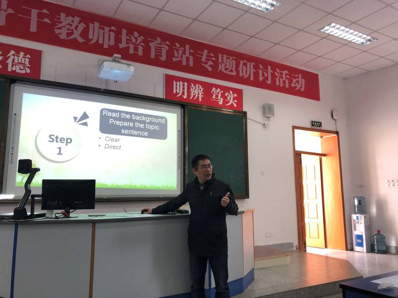 我校方庆老师则给与会者带来了一节别开生面的中考作文指导课,在带领学生回顾写作试题的组成部分和优秀作文的标准后,用hamburger 的组成形象生动地介绍如何写好一个hamburger paragraph,并以kids and learning为题,逐步引导学生进行写作练习,环环相扣,有的放矢。