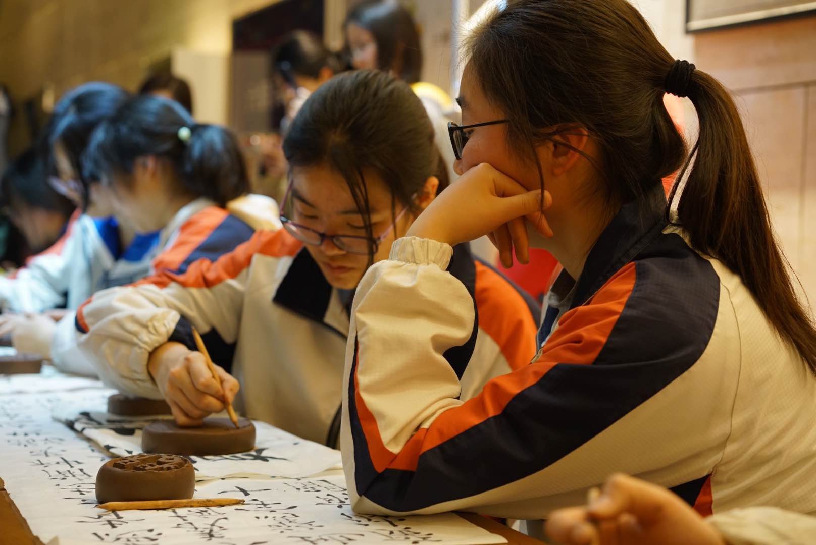 接着,学生们跟随曹启海老师转移到六朝科学堂,围坐在长长的工作台旁,发挥艺术才能体验瓦当仿古制作。美术老师指出瓦当制作融书法、篆刻和绘画于一体,是水、火和土的艺术,他循循善诱指导学生掌握瓦当的造型特点,耐心引导学生自主展开图案设计。一阵紧锣密鼓的泥坯塑形、刻刀制图、上色拓印后,南外学子将传统图案与现代理念相结合,出色地完成了瓦当创作。这节别开生面的选修课让大家认识到,历史与美术的跨界,课堂教学与博物馆资源的融合,深刻彰显了课程资源开发的生命和活力。