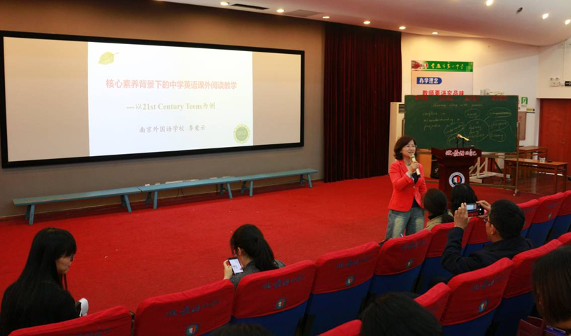 张立老师也用简短的语言介绍了自己的设计思路,随后,李爱云老师为大家带来了一场精彩的主旨讲座:“核心素养背景下的初中英语课外阅读——以21世纪英文报为例”。李老师从理论背景、作用意义、实践策略、收获反思等方面详细地分析了课外(报刊)阅读在培养学生核心素养方面的意义和做法。她说,“教师通过对学生读报行为的合理引导,可以帮助其激发学习兴趣,积累语言素材,获得知识信息,强化阅读技能,开拓思维能力,为语言学习和文化认知的终身发展奠定基础”。讲座中,李老师分享了南京外国语学校在报刊阅读教学方面的具体操作办法,例如通过朗读报刊文章来提升学生的口语表达能力、布置报刊摘抄来帮助学生积累词汇与句型、读书节时开展报刊读后感征文活动促进学生语言综合能力的运用等,并借助于多个课例向听课老师详细介绍了如何通过报刊阅读指导课培养学生的阅读策略和核心素养等。李老师的讲座逻辑清晰、有理有据、内容详实,在场的老师们无一例外地被讲座内容深深吸引。
