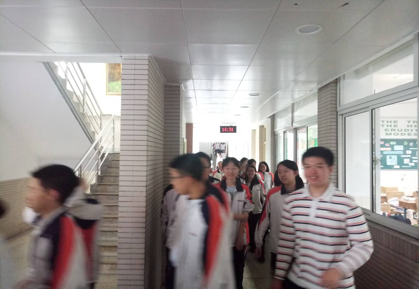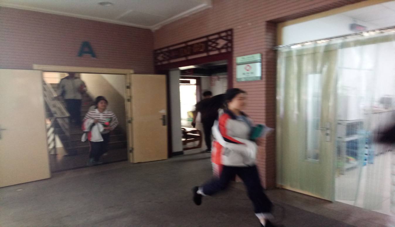 下午2:30第一遍警铃响起,按照疏散预案要求,同学们没有急于冲出教室,而是找地方躲避,保护好身体的重要部位。当第二遍警铃响起时,同学们开始有序从教学楼内疏散。