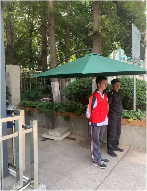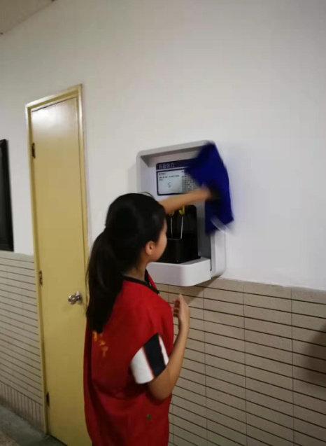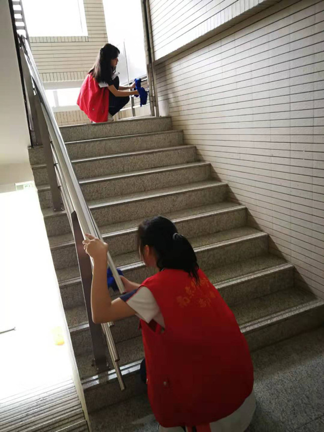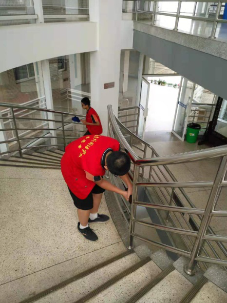 我们被分散在校园的各个角落,有在教学楼内的,也有在教学楼外的;有挺拔地站在大门口的,也有弯腰擦拭桌椅的。我们虽然岗位、职责不同,但相同的,是那股认真的劲儿。有的同学结伴而行,共同擦拭着形状各异的栏杆,看起来工作量不小,但几个人合作,一会儿就完成大半任务;有的同学在操场旁清理;还有的同学在门口站岗……走到他们身旁,看到的,大多是他们认真工作的身影。