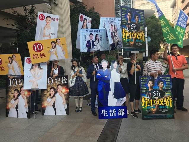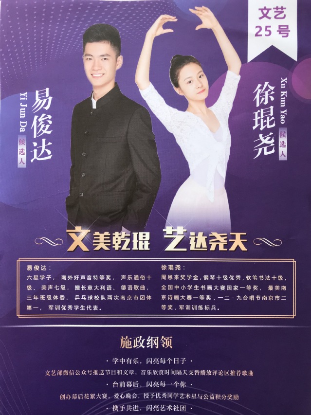 F楼一楼张贴了各组候选人的宣传海报。宣传部长候选人要求的手绘海报,生活部长候选人的主题海报,还有其他候选人的宣传板报,都很好地展现了自己的施政纲领。路过的同学们仔细地观看一张一张海报上的施政纲领内容,pick自己心仪的候选人。