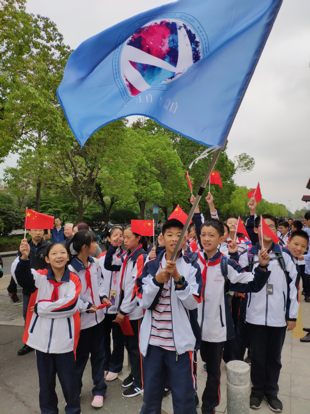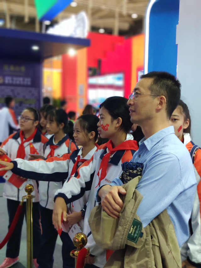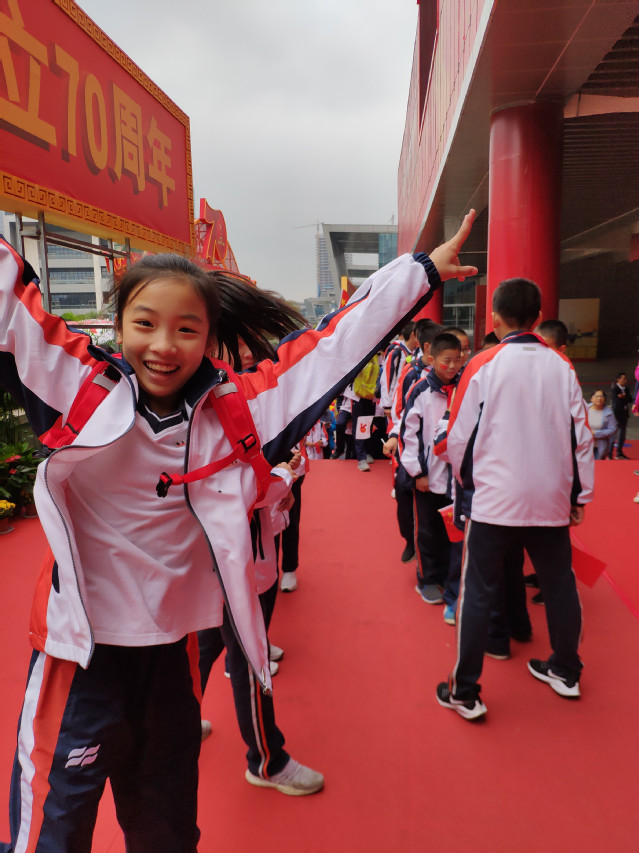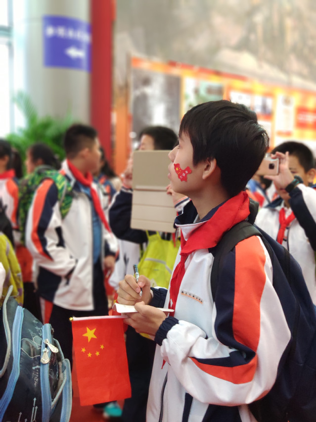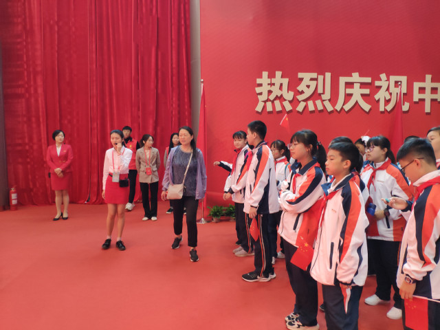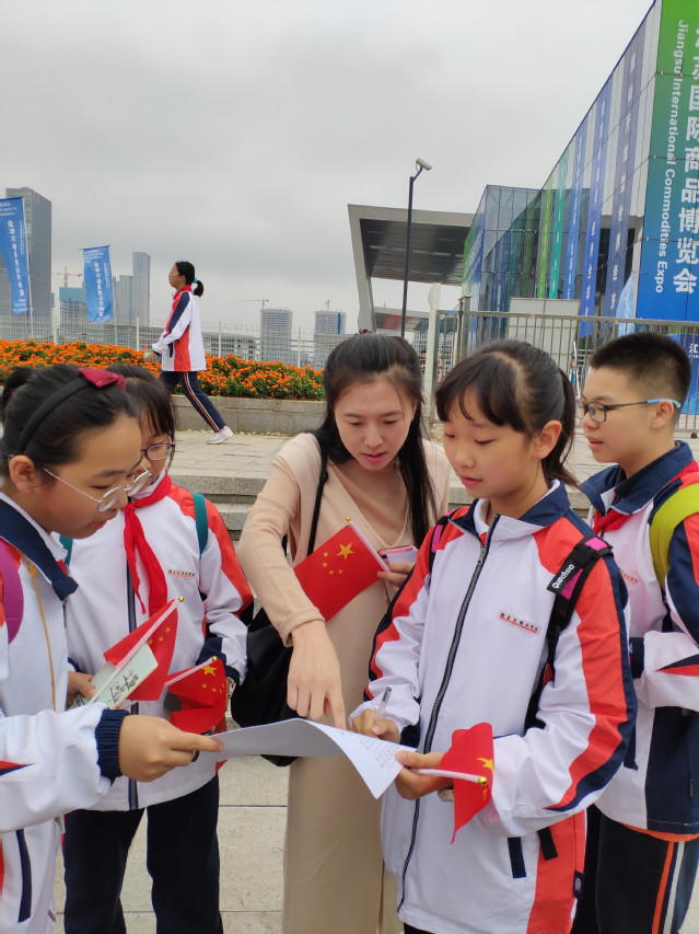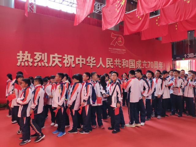 2019年10月7日中午,南京国际博览中心正大门广场上人头攒动,热闹非凡。来自南京外国语学校学生处的老师、初一年级的班主任和学生、家长代表900余人统一着装,手持小国旗在此集合,正式拉开了“礼赞新中国,奋进新时代”的参观序幕。