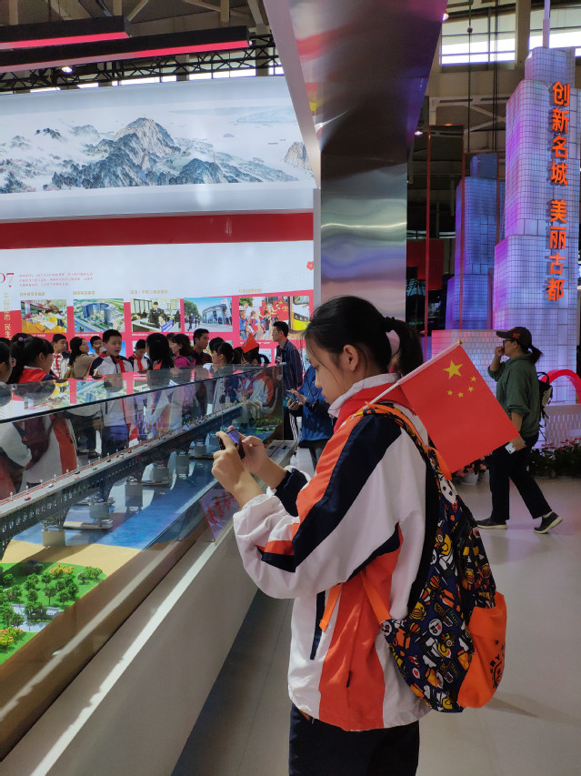 走进展馆内,仿佛穿越了一条70年的时光隧道,综合展、成就展、地区专题展纷至沓来,集中展示了100多个“江苏第一”“江苏唯一”和“江苏之最”,让我们应接不暇。这里的每个展区设计都很精心,努力让每一个前来参观的人都记得起历史沧桑、看得见岁月留痕、留得住文化根脉,与之产生共鸣,我们也不例外。在这一幅幅珍贵的照片、一段段生动的视频、一个个实物场景展示前,同学们驻足仔细观看,认真听取专业讲解员的介绍,就连随行的家长们也兴趣盎然,还不时询问着相关历史、知识,真心为我们大江苏在新中国建设、改革和发展中所取得的巨大成就而自豪。