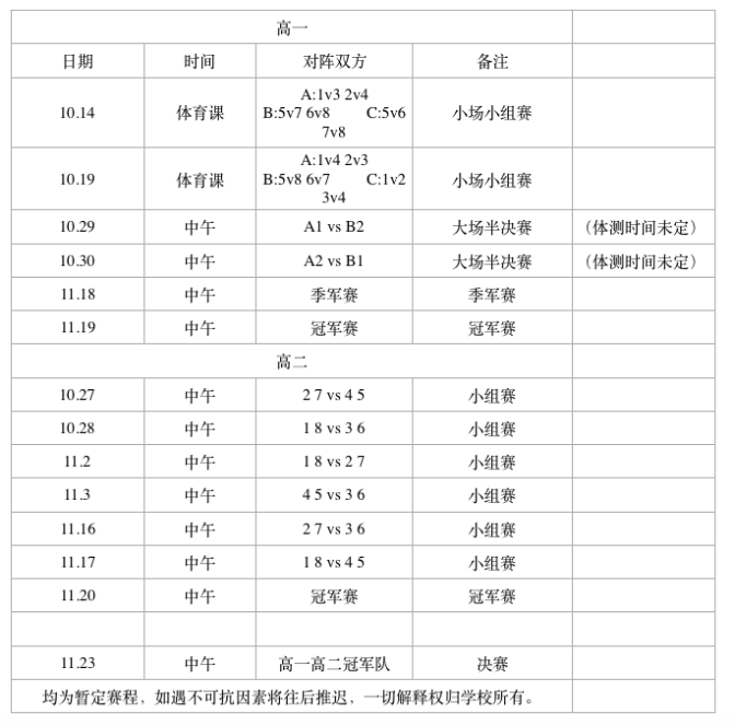 3.高二年级赛制为四支球队小组循环赛,排名规则同高一小组赛排名规则。小组赛一二名球队进行决赛,决出冠军球队。