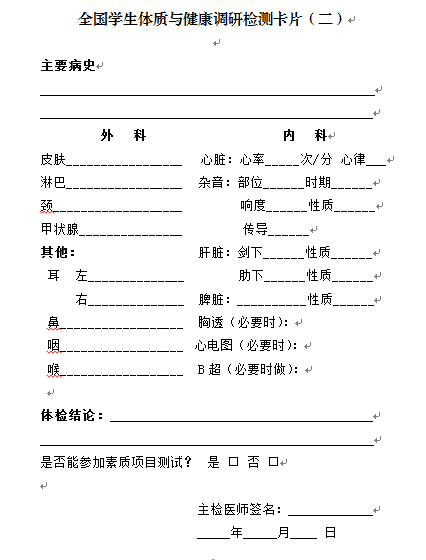 监测样本为体测样本。体测样本由参加健康体检的学生中筛选出的正常学生(正常学生指能进行各项体育锻炼活动,发育健全、身体健康的学生)构成。凡心、肝、脾、肾等主要脏器有病者,身体残缺、畸形者,急性病患者或一月内患过高烧、腹泻等急性病、体力尚未恢复者及处于月经期间的女生均不得参加素质项目的测试。
