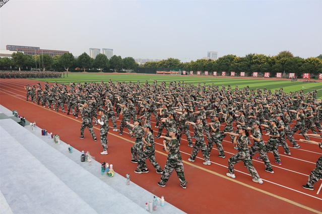 “一二一、一二一”、“拼搏青春、一往无前!”训练场上,响彻着各连队精神饱满的喊声。走直步时前面的手臂要成45度,后面的手臂要伸得尽量高,同学们按照教官的要求,精准控制着自己的摆臂动作;踢正步时整个连队要一起落脚,步调一致声音才会整齐,同学们练习了一遍又一遍,终于形成了默契,气宇轩昂,体会到了军人的感觉;喊口号时要有气势、有魄力,于是同学们学习用腹发力,把口号喊得声势浩大,显出排山倒海之势。“嘿、嘿哈嘿…哈、杀!”男女生军体拳的同学们轻如飞燕、猛如霹雷。出拳、劈掌、侧踢…一个个动作行云流水、刚劲有力。