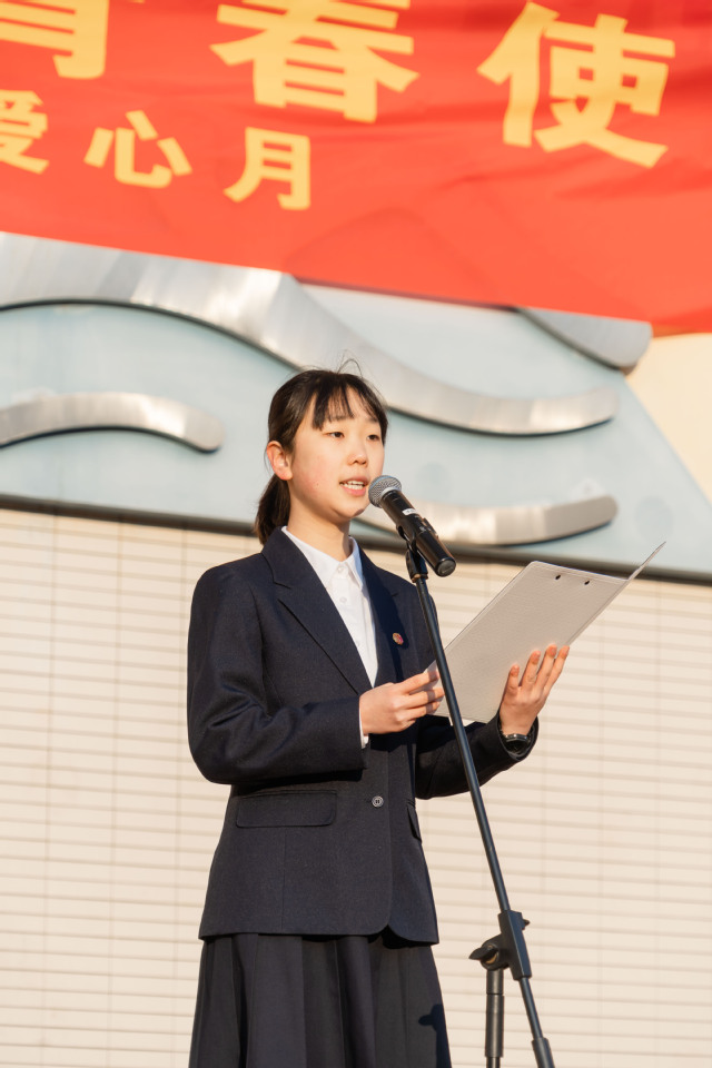 纪涵予:感谢章家钰同学精彩的发言。让我们与爱心同行,弘扬雷锋精神,践行青春使命。本次爱心月,我们还将通过开展“爱心义卖”、“慈善义演”、“慈善篮球挑战赛”、“感恩有你”等活动,营造“学雷锋,献爱心”的良好氛围,以实际行动书写雷锋精神的新篇章。