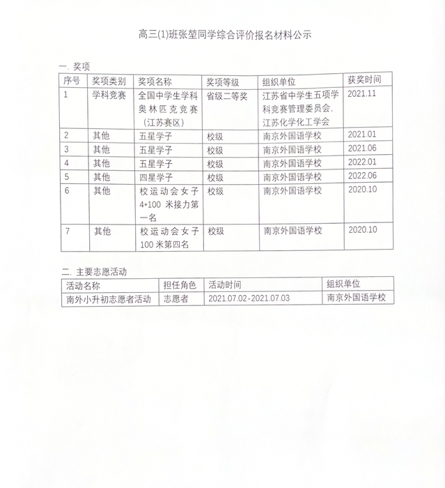 3.经本人申请,现将综合评价获奖情况申报材料公示如下: