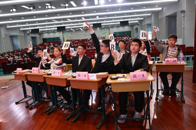 第二部分为高中“五四”辩论赛决赛。此次辩论赛意在引导同学们结合新时代的背景和特征,探讨自媒体时代,人们与真相的距离,以此激发大家的批判性精神,正确对待良莠不齐的信息。正方的观点是:自媒体时代我们离真相越来越近;反方的观点是:自媒体时代我们离真相越来越远。比赛的3位评委分别为南京大学新闻传播学院胡翼青教授、南京外国语学校南部新城综合管理办公室主任尹荷蓉老师、初一年级组长戴霞老师。正方四位辩手分别为高二(2)班刘若卉、高二(1)班邵舒婷、高二(7)班张佳宁、高二(4)班钟可涵,反方四位辩手分别为高一(6)班孟佳琪、高一(10)班姚亦辰、高一(10)班俞越、高一(4)班吉书瑶。通过激烈的思维碰撞和精彩的交锋质询,反方代表队在此次辩论中更胜一筹,正方张佳宁同学、反方姚亦辰同学凭借突出表现荣获“最佳辩手”称号。胡教授对辩论赛做了精彩点评,他肯定了同学们的精彩表现,也指出面对信息时代多样的媒体渠道,同学们要冷静思考,理性判断,对信息做到求真求实。