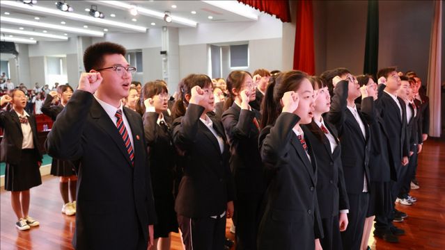 颁奖完毕后,新团员上台宣誓,老团员重温誓词,校团委书记王少林领誓。