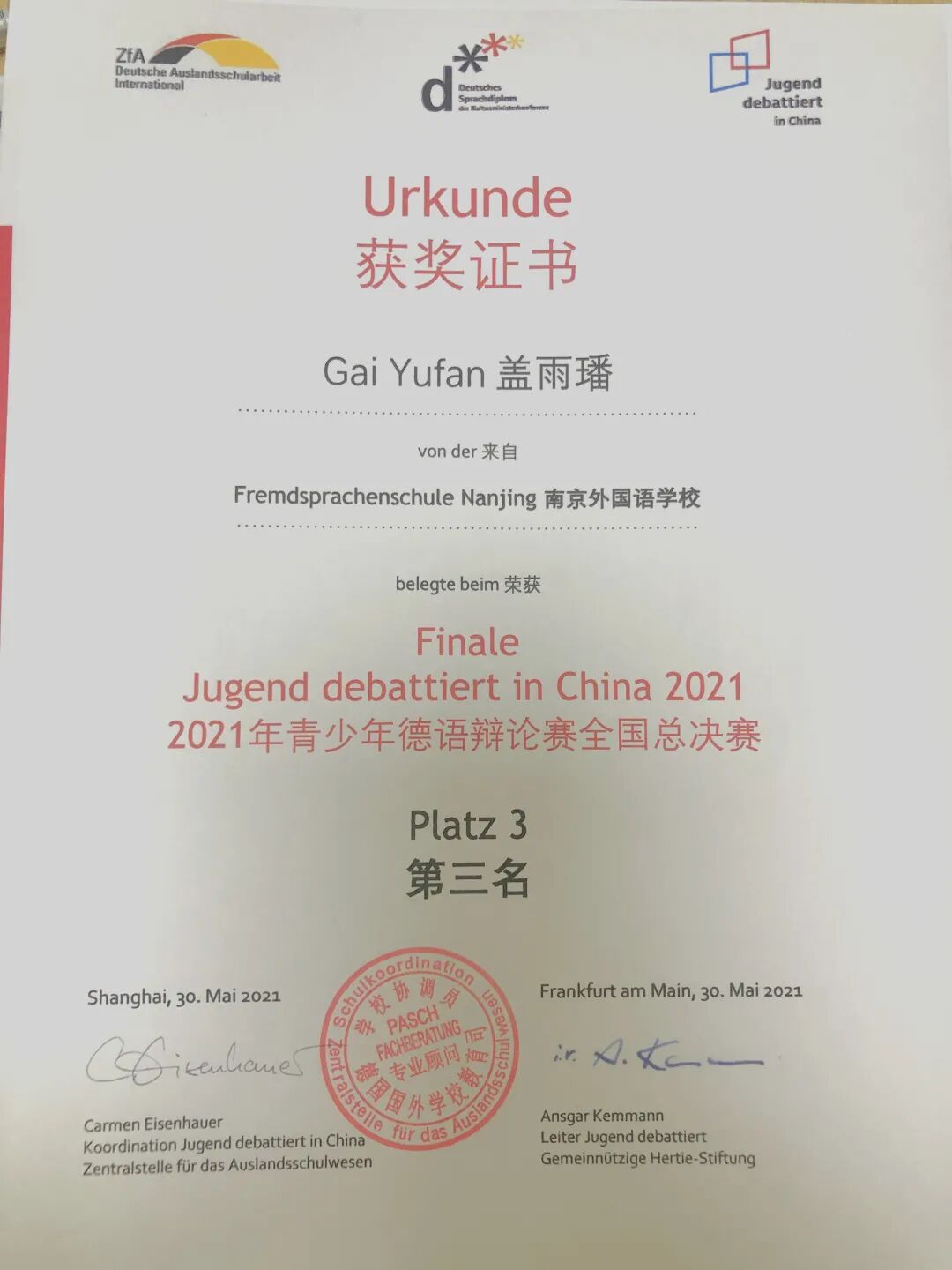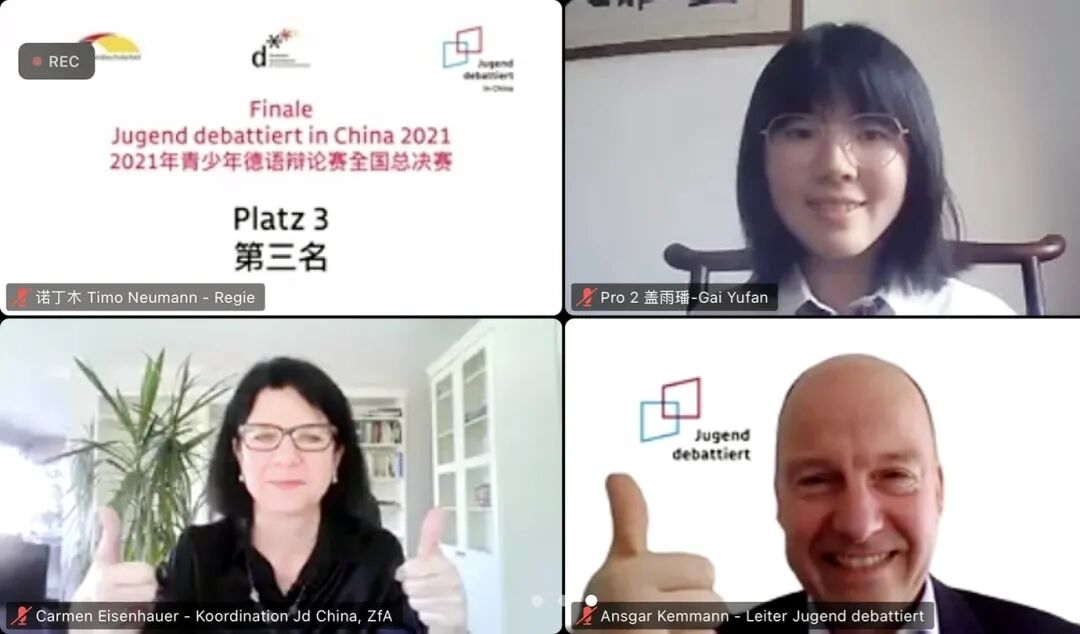在总决赛中,四位选手在决赛辩论中就“是否应该允许笔试通过机考的方式进行?”进行了激烈讨论,我校高二(5)班的盖雨璠同学凭借她优秀的语言能力、灵活的辩论技巧和沉着冷静的辩论风格获得了今年青少年德语辩论赛的第三名。这是南外德语班学生继2018年曹毓堃(全国第三)、2019年张皓博(全国第一)再一次进入全国四强,可喜可贺!