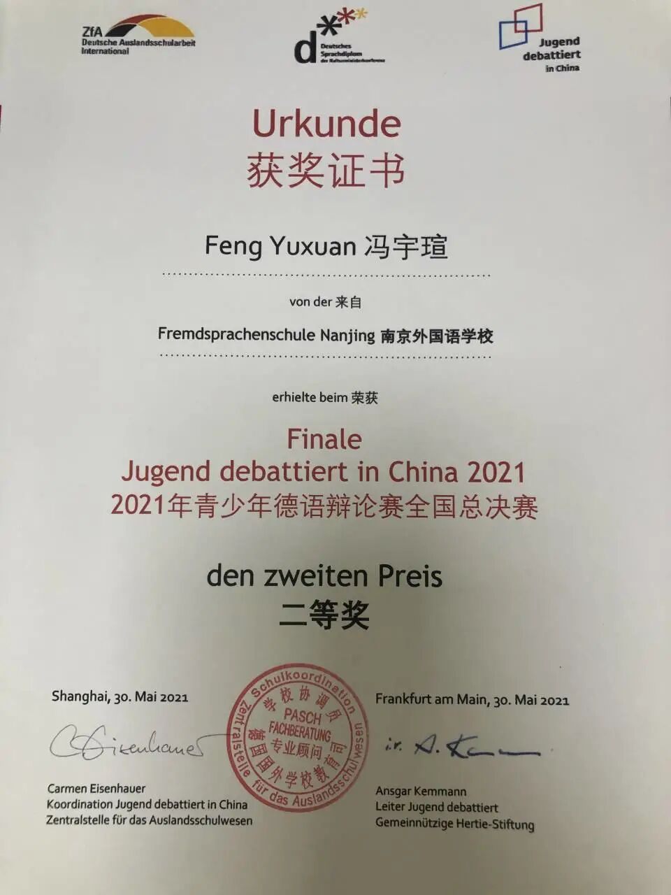 青少年德语辩论赛是代表中国青少年最高德语水平的比赛,由隶属于德国外交部的德国国外学校教育司(ZfA)主办。受疫情影响,今年的辩论赛于5月29日至30日在线上举行。共有来自22所DSD学校的24名高一高二学生参加。我校高二(5)班的盖雨璠、冯宇瑄同学分获全国第三名和二等奖。