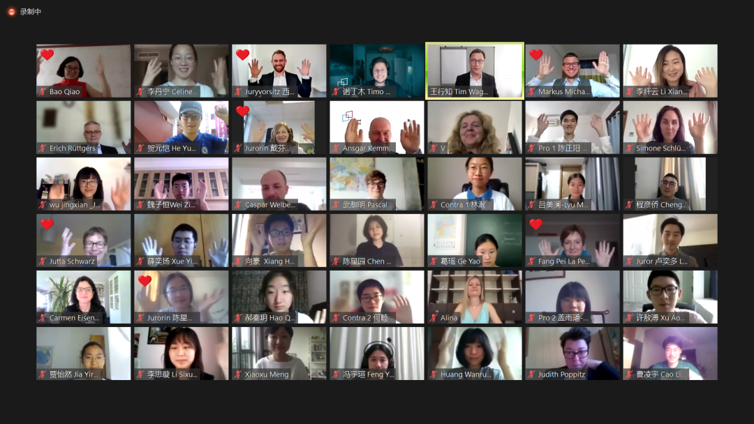 此外,也要感谢德国驻上海总领事馆、德国ZfA以及来自中德两国各位评委老师们的尽职尽责。尤其是本次辩论赛事筹备小组的辛勤付出促成了线上比赛的圆满成功。
